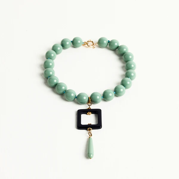 La Collana girocollo goccia Almala, fa parte della collezione Àlmala Fall/Winter 24/25 e rappresenta una reinterpretazione contemporanea di collana con perle. Il girocollo, composto da beads di grandi dimensioni è caratterizzato da un pendente a goccia sostenuto da elemento squadrato.