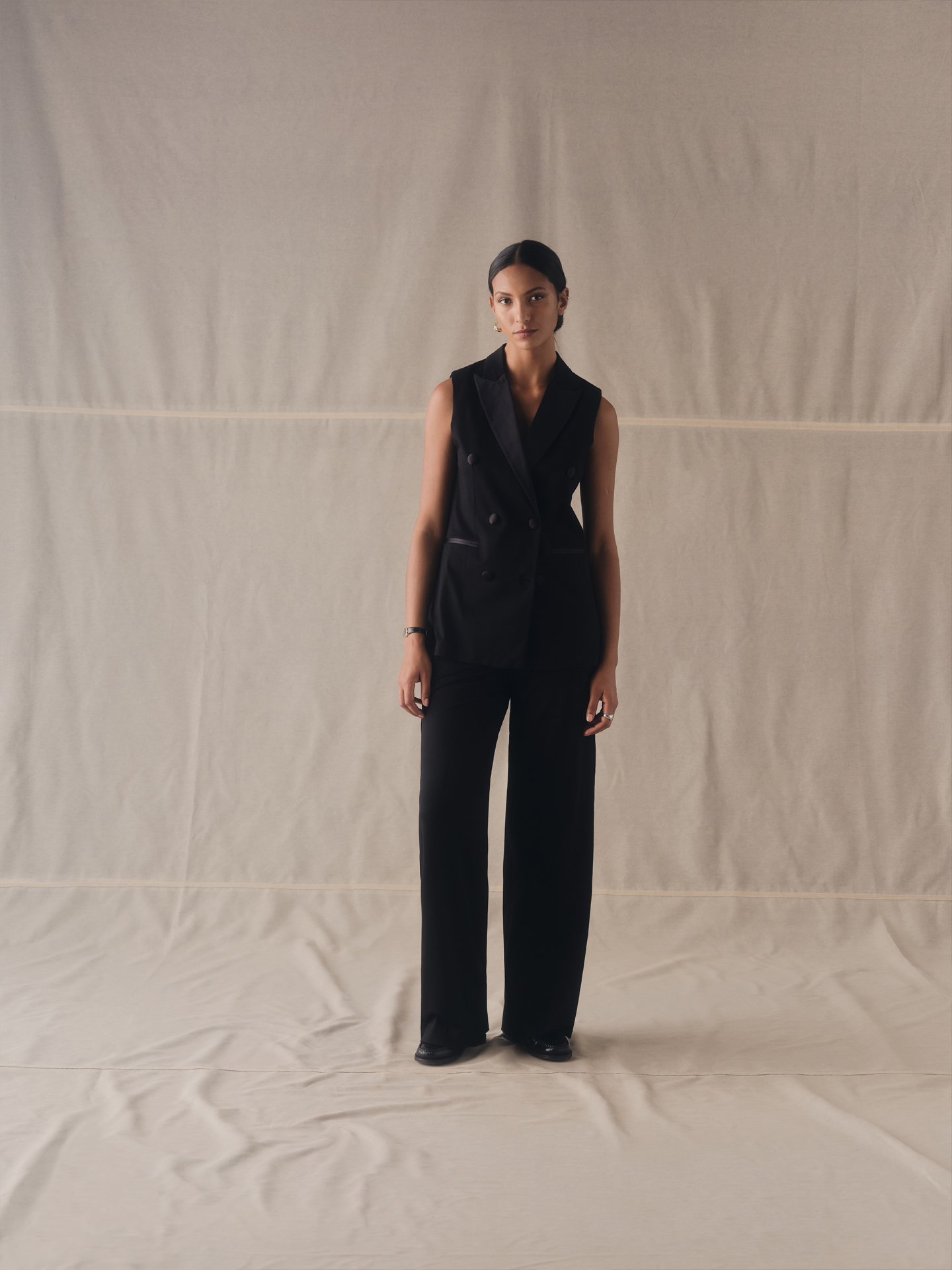Il Doppiopetto smanicato CIRCOLO 1901, è una giacca doppiopetto smanicata in Jersey Filo di Scozia tinto light. Revers a lancia in raso, con chiusura sei bottoni in raso e tre tasche a filo. Completo con il pantalone masculine FD3035.