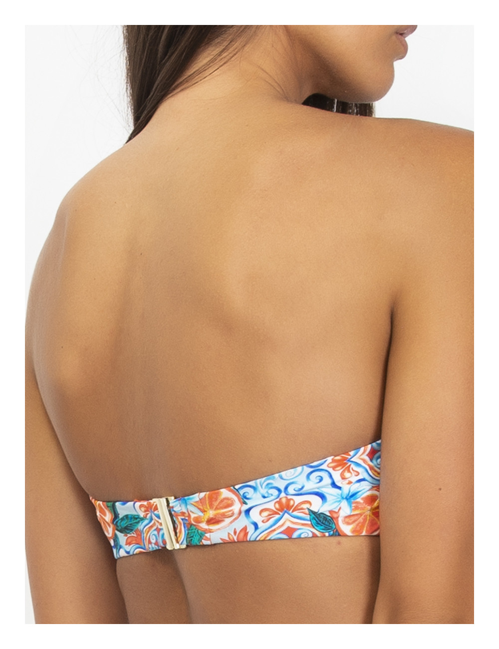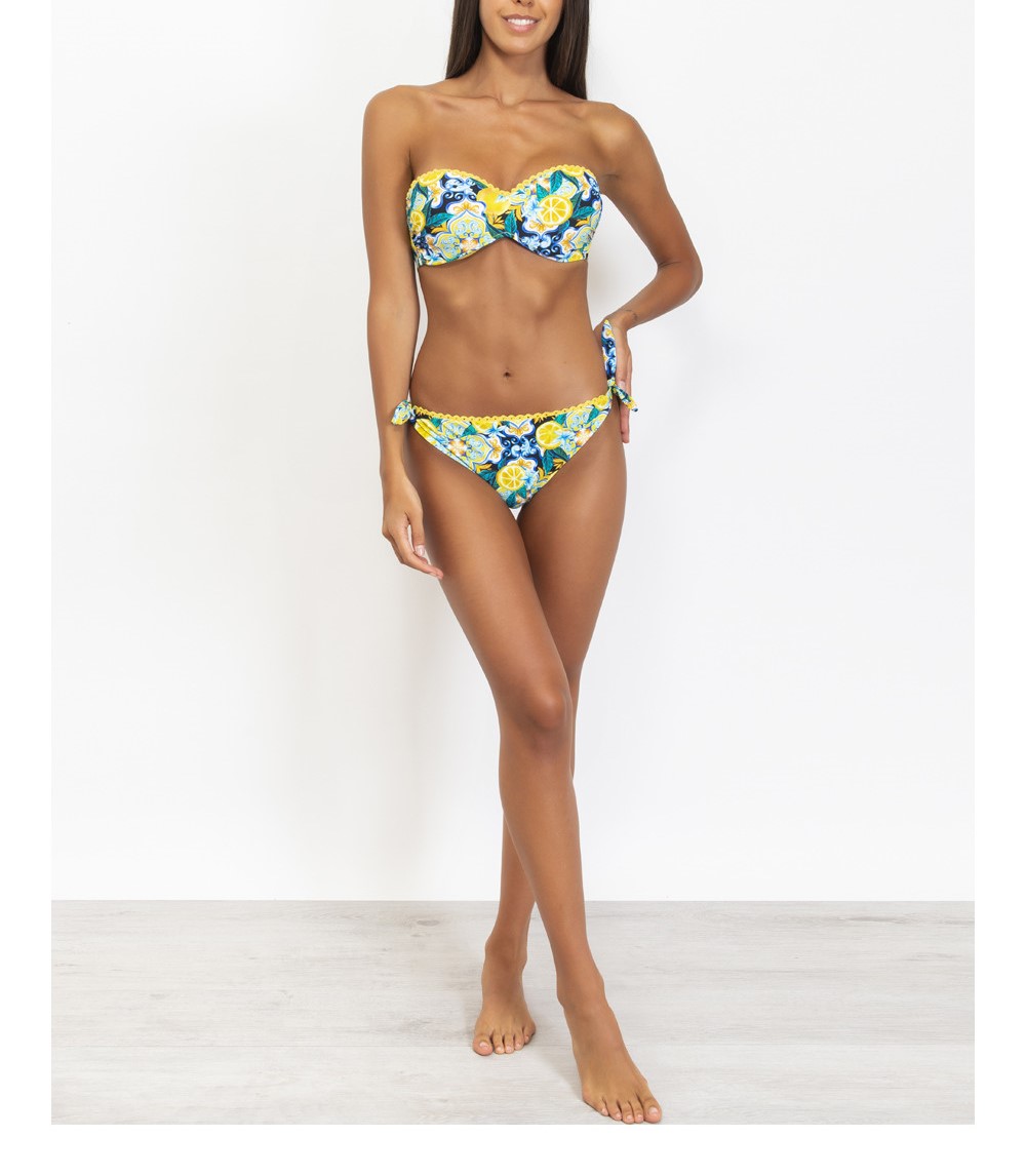 La Fascia ferretto sicily VERDISSIMA, è un bikini top a fascia dal taglio dritto con ferretto invisibile che garantisce sostegno anche ai décolleté più generosi. Fresca e vitaminica, la stampa double micro-macro evoca i colori della Sicilia con motivi pittorici di frutti, foglie e fiori di agrumi allover. La stampa è proposta in due sofisticate versioni: con limoni nei toni del giallo e del blu e con arance nei toni dell’arancione e dell’azzurro. Bikini top impreziosito da passamaneria effetto uncinetto. Dotato di balenette laterali che aiutano a sostenere e spallina removibile.