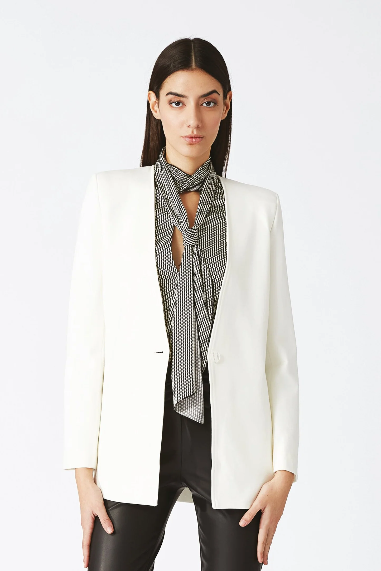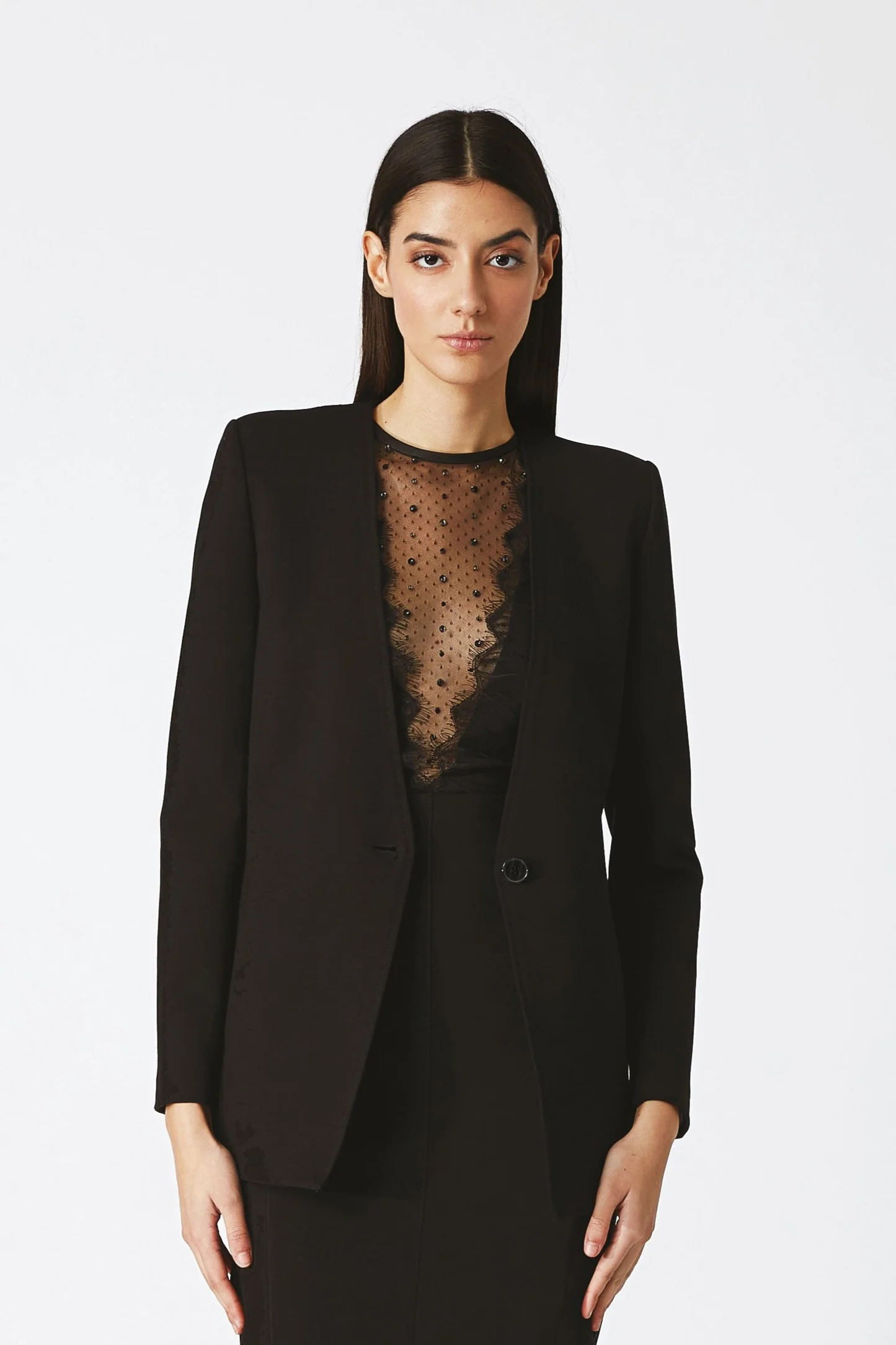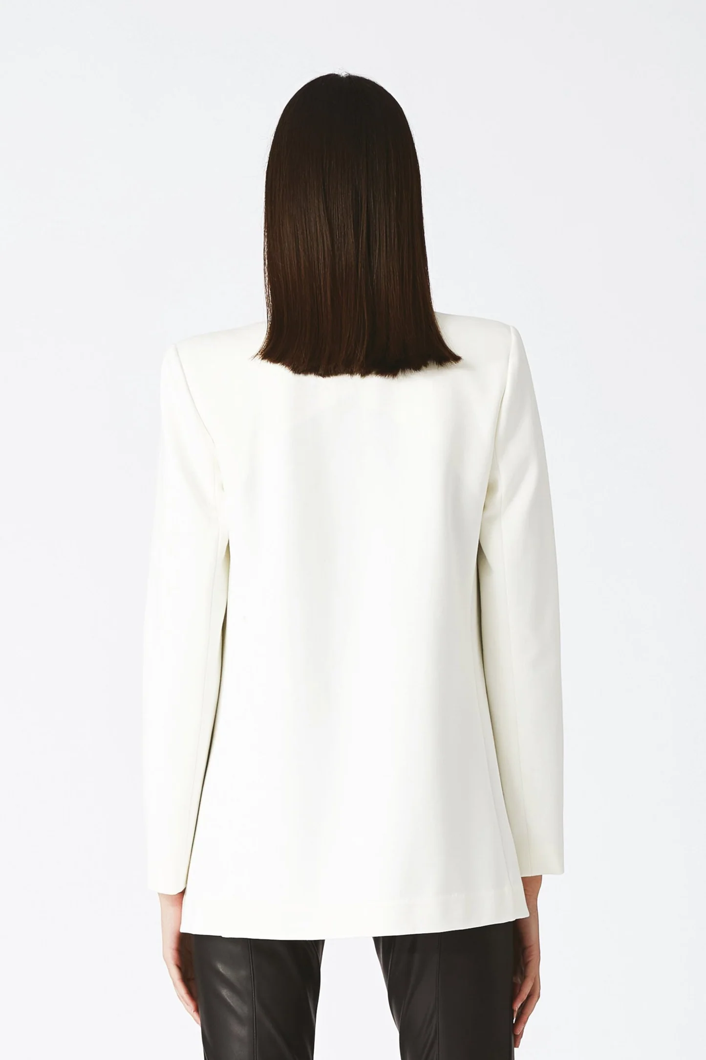 La Giacca Baciata NENETTE, è un capo di alta moda monocromo con collo smussato e realizzato in pregiato tessuto di punto milano. Dotata di un solo bottone, questa giacca monopetto si distingue per la sua eleganza e raffinatezza. Perfetta per un look formale e sofisticato.