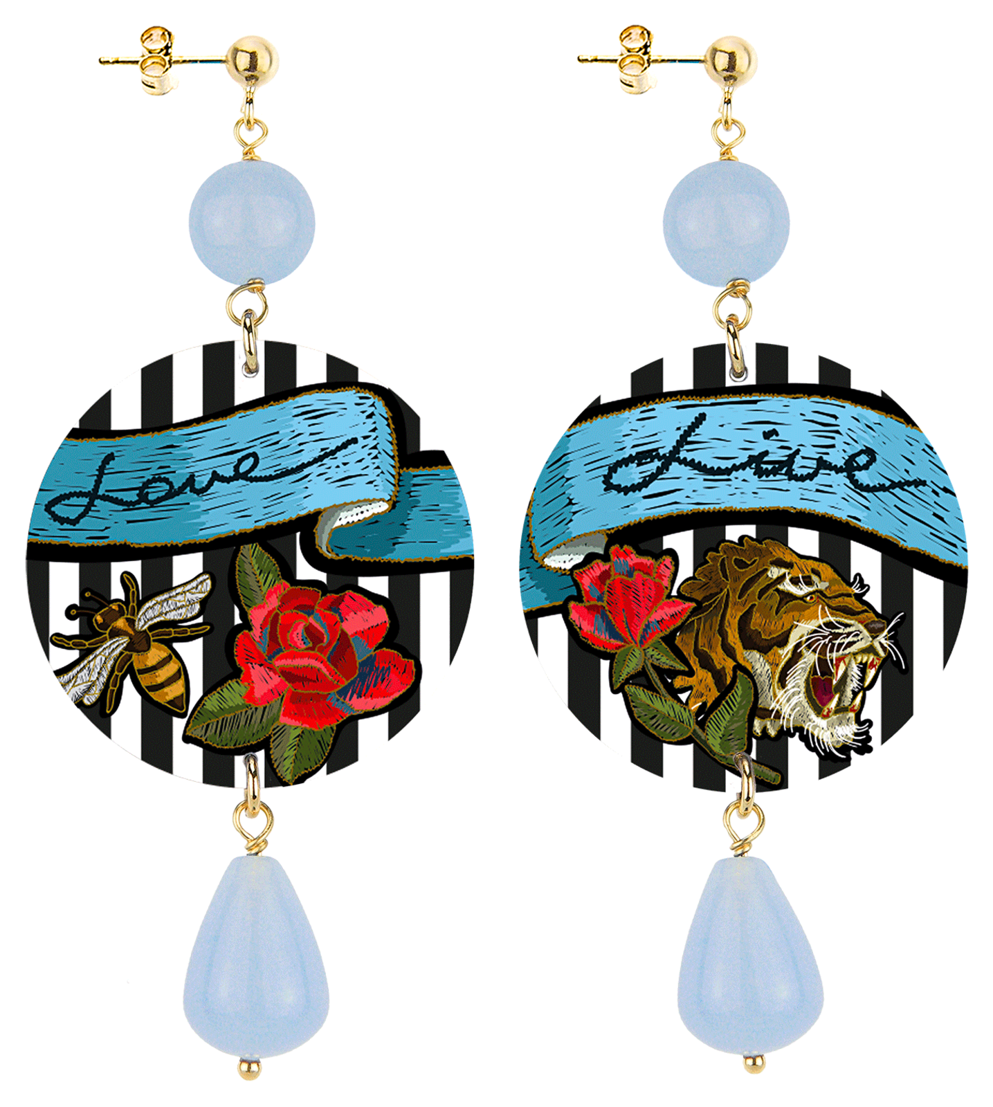 Gli orecchini della collezione The Circle di Lebole Maison sono realizzati con capsule piatte stampate su banda stagnata, montati in ottone galvanizzato oro e pietre naturali. L’asimmetria è data dalle diverse immagini impresse nella capsula.