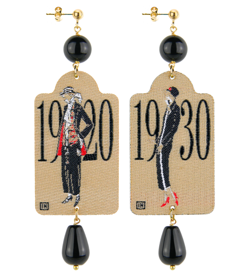 • Orecchini con un’ etichetta in tessuto ricamata montata in ottone galvanizzato oro