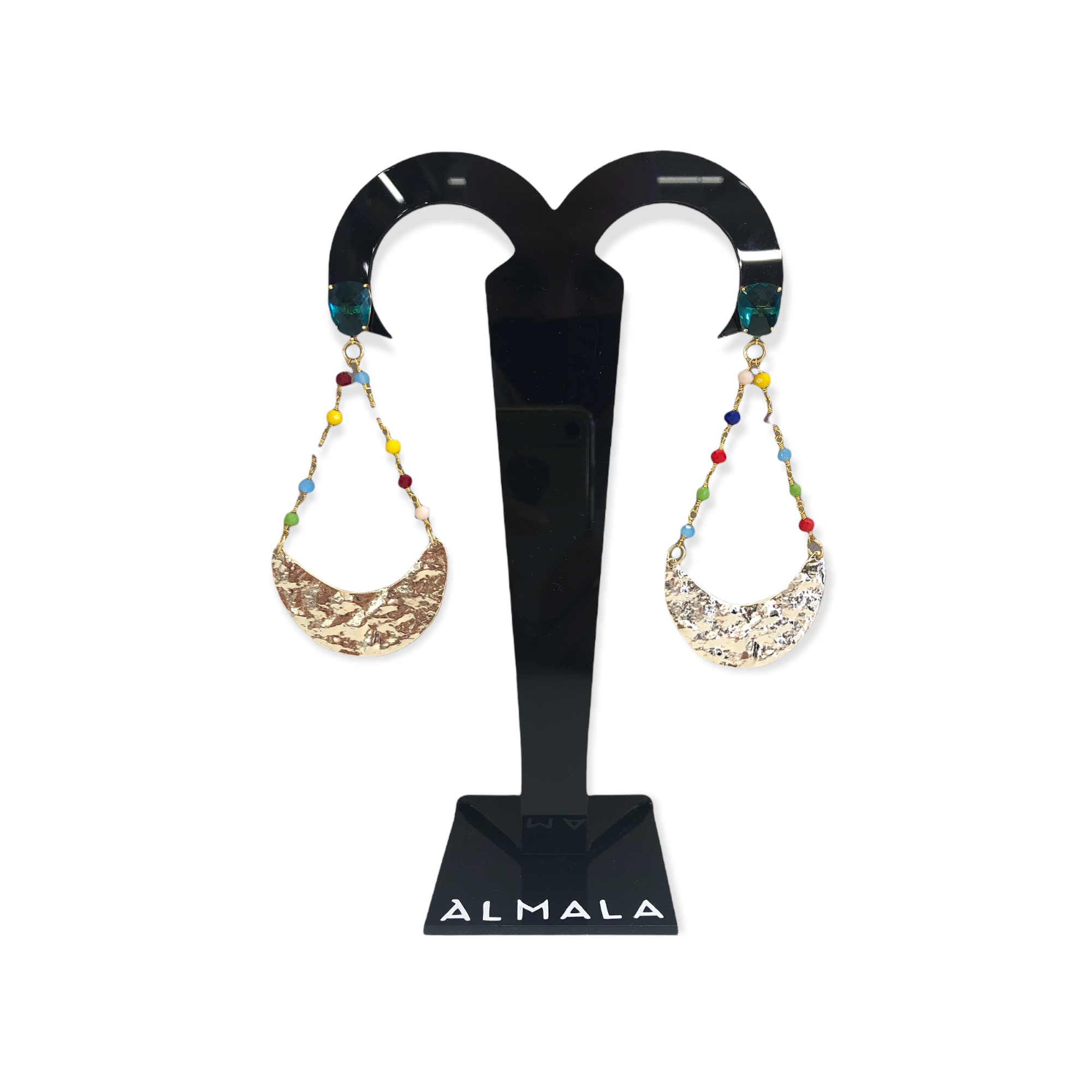 L’orecchino gipsy ALMALA, è un orecchino con pendente in ottone lavorato a mezza luna, rifinito con quarzi e cristalli.