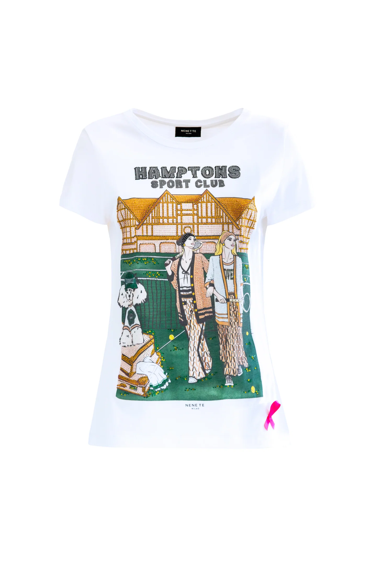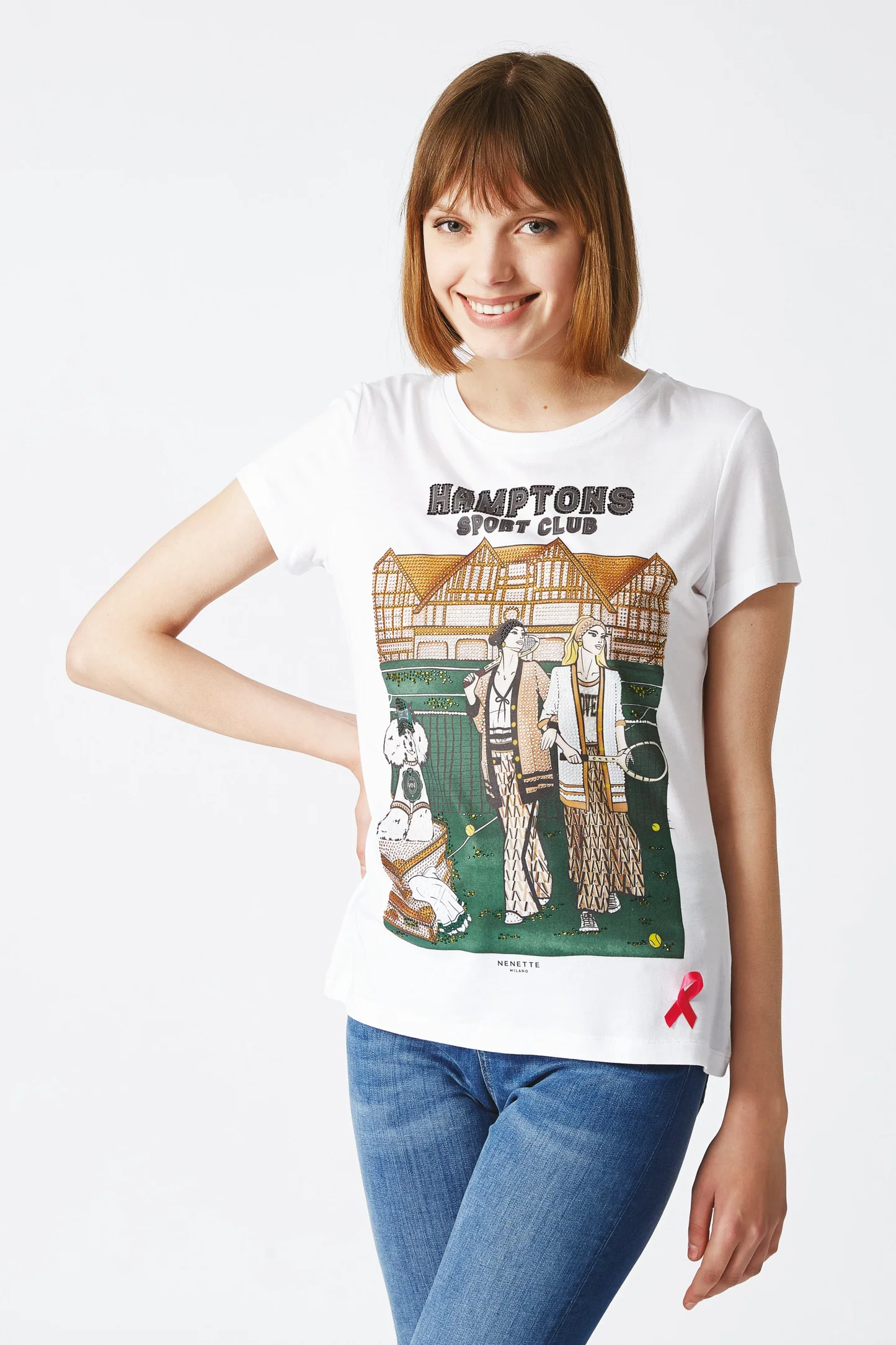 La T-shirt Dhamptons NENETTE, è una t-shirt a manica conta con stampa “Hamptons”. Questa t-shirt è legata all’iniziativa solidale FOLLOW THE PINK della Fondazione IEO-MONZINO.